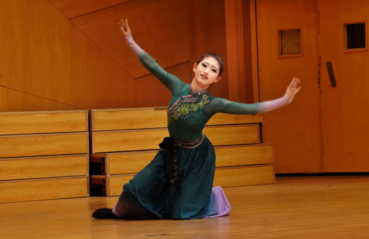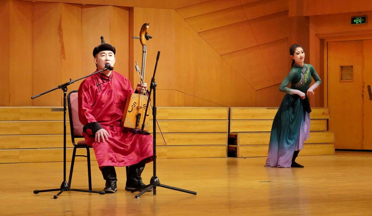 音乐会在《乌兰巴托的夜》的悠远意境中拉开序幕。国家级非遗呼麦传承人霍日查的低沉吟唱,如草原晚风掠过耳畔,与马头琴的苍凉旋律交织,瞬间将听众带入星光下的草原秘境。舞台上,蒙古舞者刚柔并济的身姿与空灵的女声相和,毡房、星光、风中的思念,都在音符的流淌中具象化,让“弦歌”所承载的文化记忆,以最质朴的方式叩击心灵。这不仅是对民族音乐的深情演绎,更是对非遗生命力的鲜活诠释。