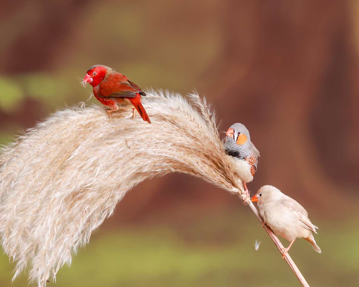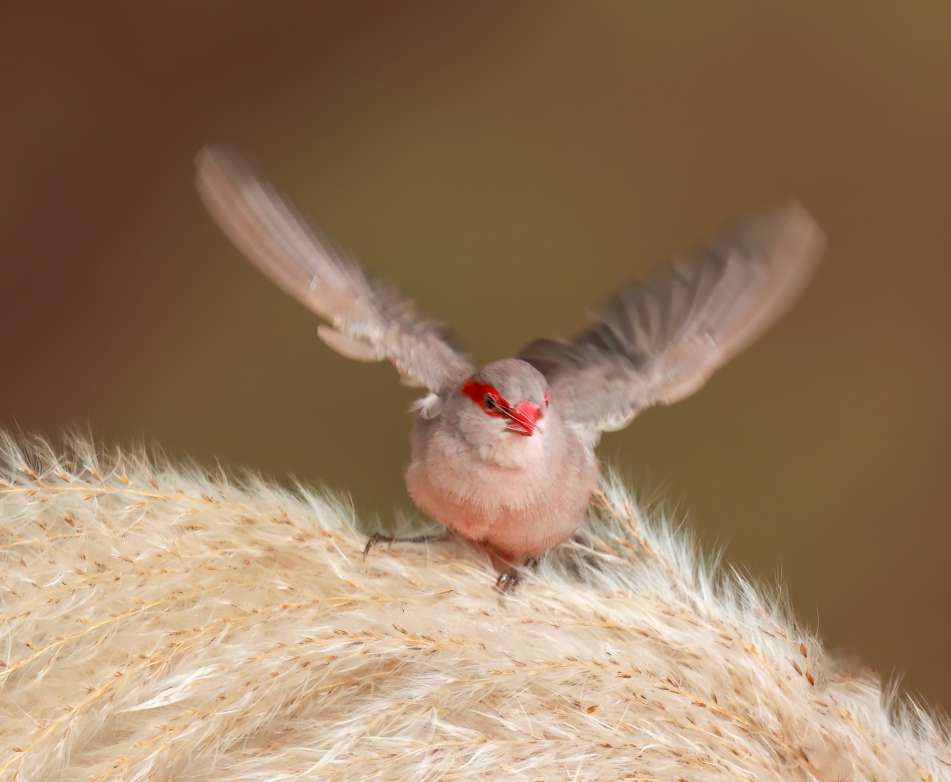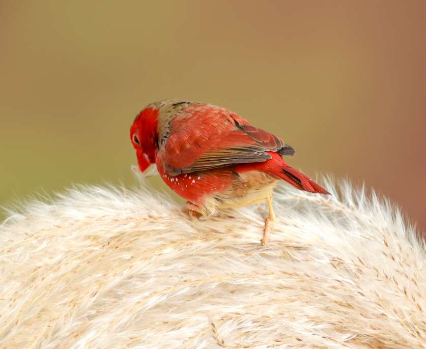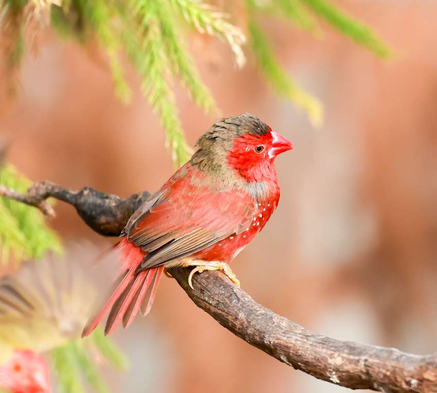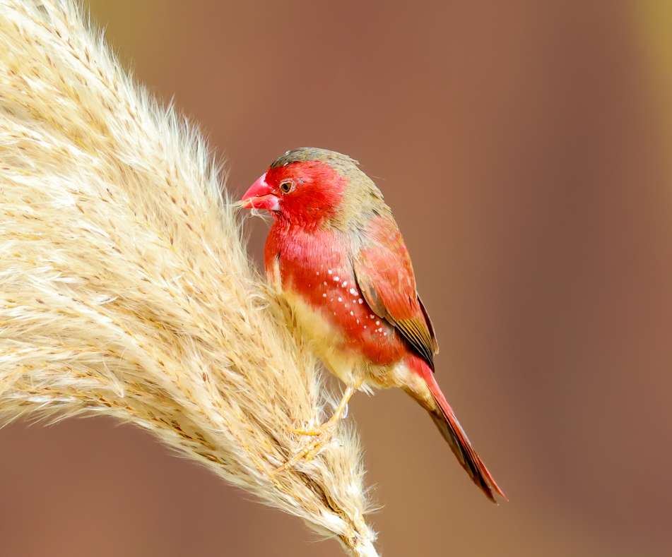 赤胸星雀最引人注目的就是它鲜艳的红色羽毛,特别是雄鸟,外形非常亮眼。它的面颊和胸部是醒目的樱桃红色,并且在红色的胸羽上,点缀着白色的小斑点,整体羽毛红至深红色。