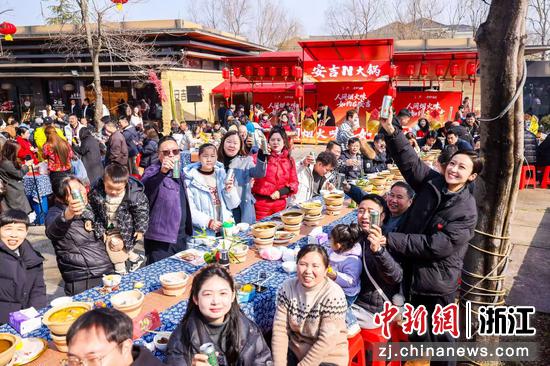 “过年啦!吃饭喽!”锣鼓声中,百人长桌宴正式开席。长达百米的桌子旁,来自天南地北的游客与本地村民比邻而坐。腌笃鲜、红烧肉、竹林鶏等锅子被逐一端上桌,游客们品尝着热气腾腾的菜,欢喜地聊着天。大家吃得开心,大厨忙得乐乎。铁勺不停地在锅里翻转,锅中蒸腾着的是最浓郁的烟火与人情。