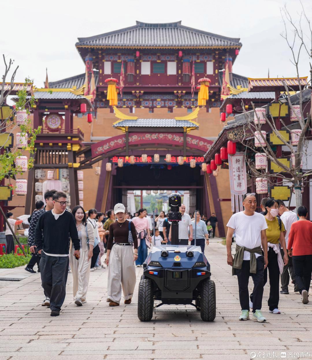 日前,在乐陵影视城里,一台子母式警用安保巡逻机器人正自主开展巡逻任务。游客们围着它拍照,民警们则通过它实时回传的画面,清晰地掌握景区动态。