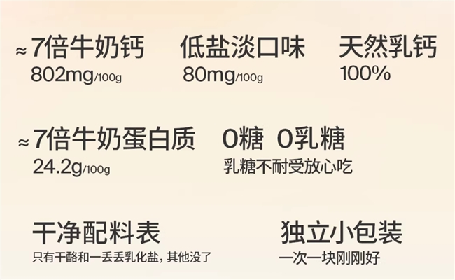 当然更重要的是,高营养密度是其脱颖而出的关键。据产品营养数据显示,每100克小圆奶酪钙含量高达802毫克,约为等量牛奶钙含量的7倍。一块约15克的小圆奶酪,即可满足1-3岁幼儿每日约24%的钙需求,高效填补孩子日常奶量不足的营养缺口。尤为值得关注的是,其钠含量较低,在提供充足营养的同时有效控制钠摄入,减轻儿童肾脏负担。
