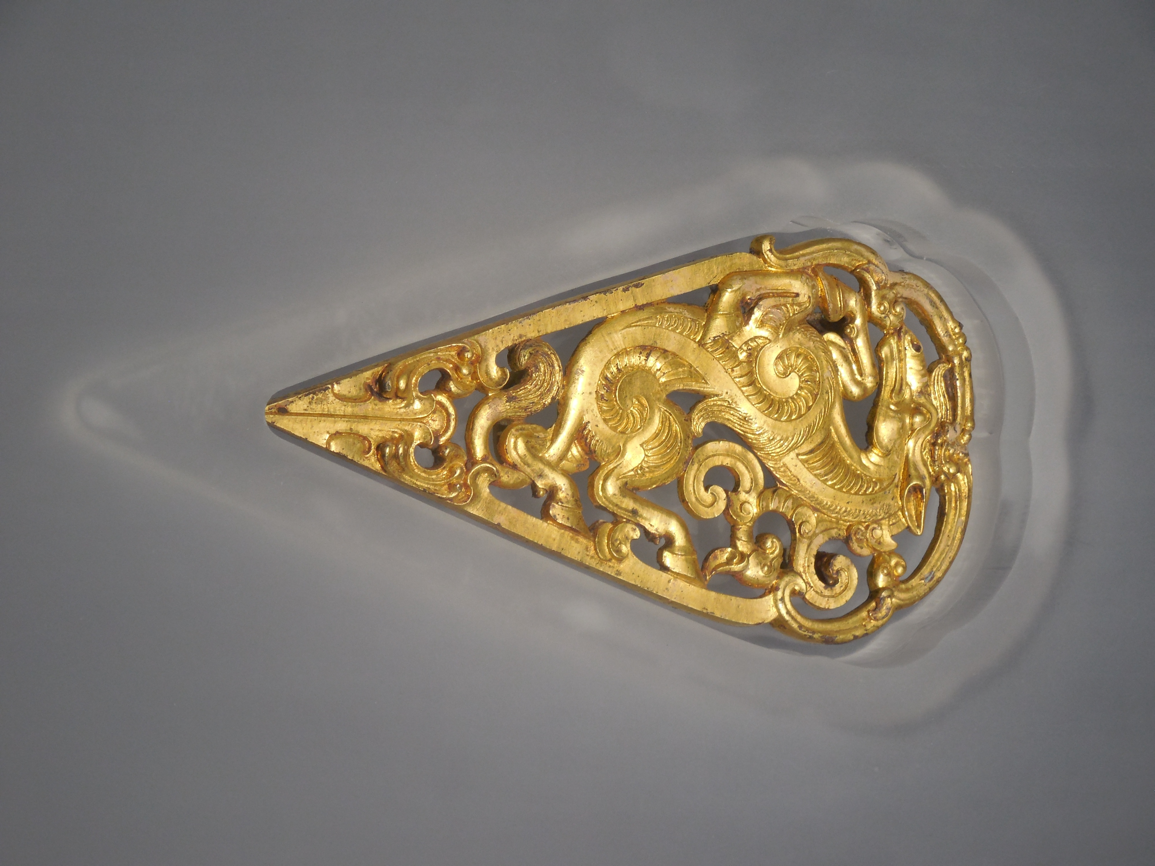 这件当卢通体似舒展的柳叶,镂空浮雕,历经两千年岁月,鎏金依旧熠熠生辉。器物中部,一匹卷曲呈反“S”形的神兽跃然其上,目光如炬,鬃毛爽利,前蹄高抬似欲踏云,后蹄反卷犹藏劲风,周身缠绕的鸟纹与云纹,似有凌云腾空、气吞山河之势。它并非寻常骏马,而是古人心中的“龙马”。传说“龙马”头生角、身覆鳞、翼生肩,非马非龙,却集两者之灵秀与雄健,是奋发向上、勇往直前的象征。