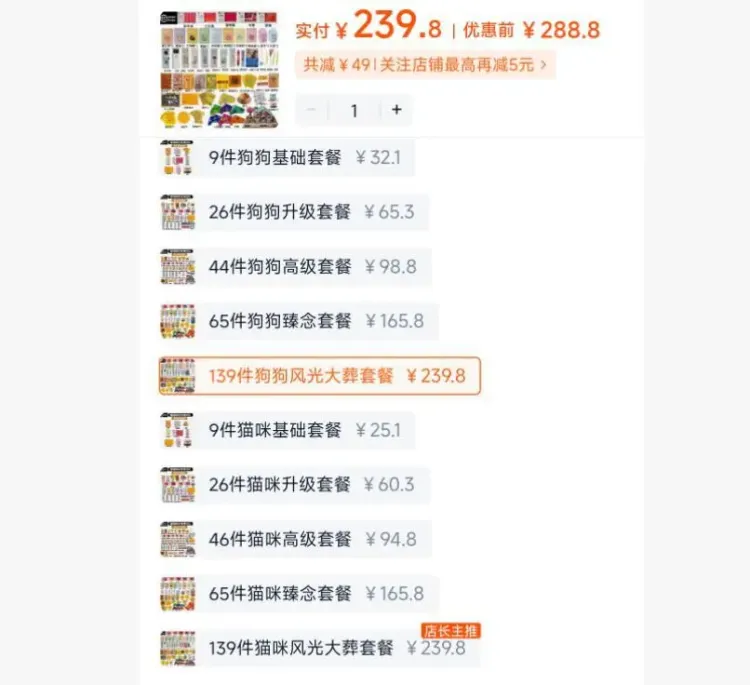 记者在某电商平台上以“宠物冥币”“宠物祭祀用品”为关键词进行搜索,发现有众多店铺正售卖宠物祭祀用品,品类繁多,从宠物日常的食物、衣物再到住所,可谓应有尽有,与现实生活几乎一一对应。记者注意到,有店铺显示全网已有2万+人付款。还有店铺售卖的“139件狗狗风光大葬套餐”祭祀品价格为239.8元,其中包含送钱表文、洗发水、洗衣机、空调,甚至伴有“仆人及伴宠”,以及金条银条等祭祀品。