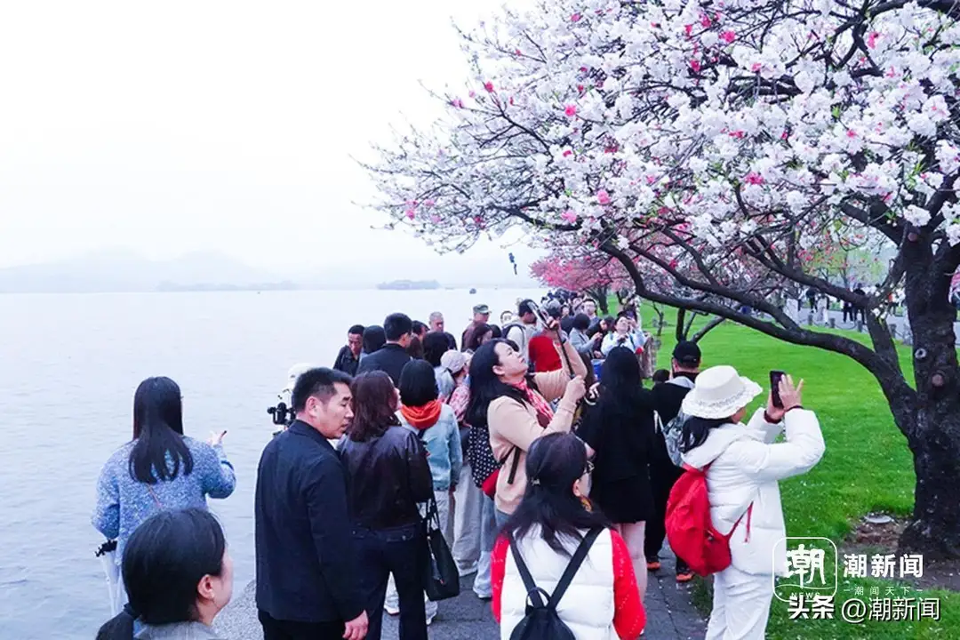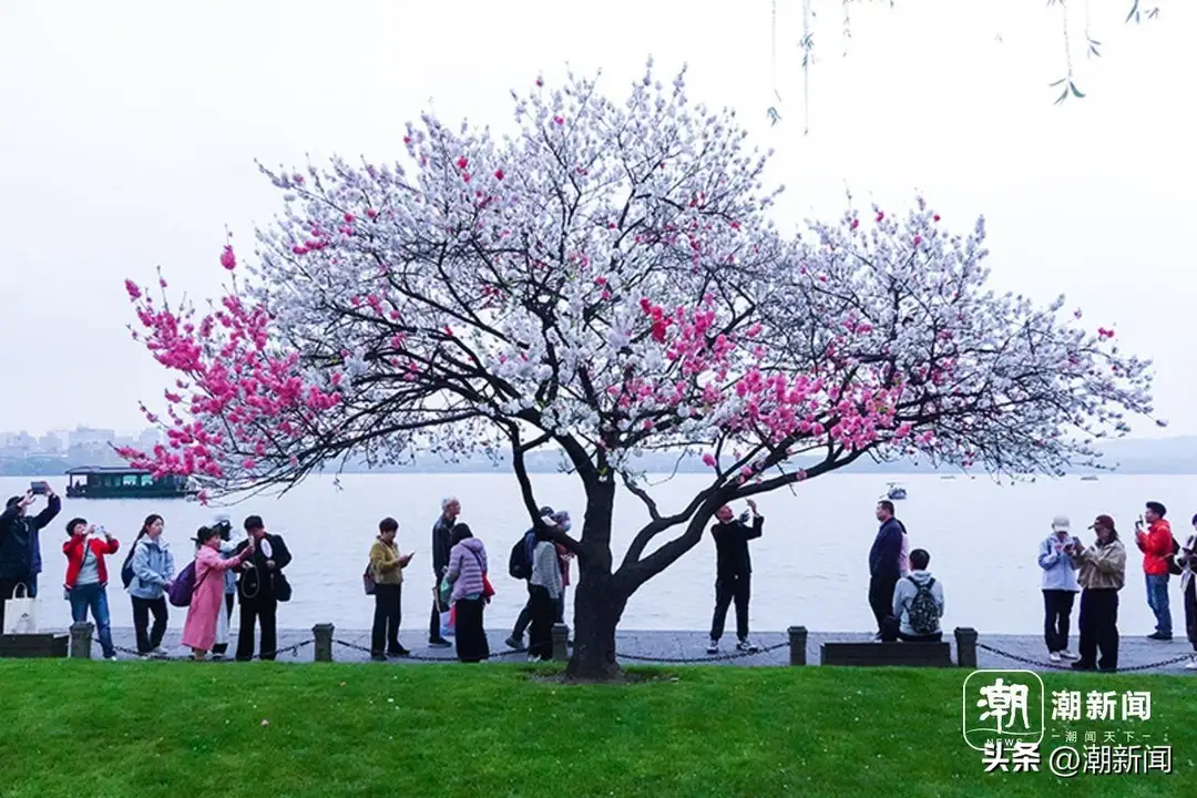 西湖双色桃花雨中盛放,游客打卡别样春意春雨绵绵,杭州西湖笼罩在一层轻薄雨雾中,尽显江南温婉。细雨中的西湖,湖水泛着涟漪,岸边绿柳轻垂,几株双色桃花亭亭而立,白色与粉色花瓣缀满枝头,更显娇嫩柔美。即便飘着小雨,也挡不住游客的赏花热情。大家撑着各色雨伞,驻足花前拍照,用镜头定格雨雾里的桃花美景,