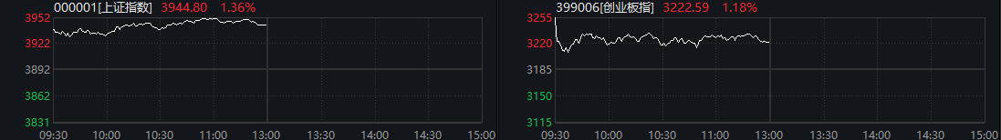 中新经纬4月1日电 1日,A股三大股指高位震荡。截至午盘,上证指数涨1.36%报3944.80点,深证成指涨1.20%报13640.05点,创业板指涨1.18%报3222.59点。